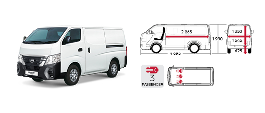 With a large load capacity, the Nissan NV350 Urvan can carry cargo up to 2.865m long, with an interior width of 1.545m and a height of 1.350m. Rope hooks are mounted on each side in the panel van models to keep your goods secured.